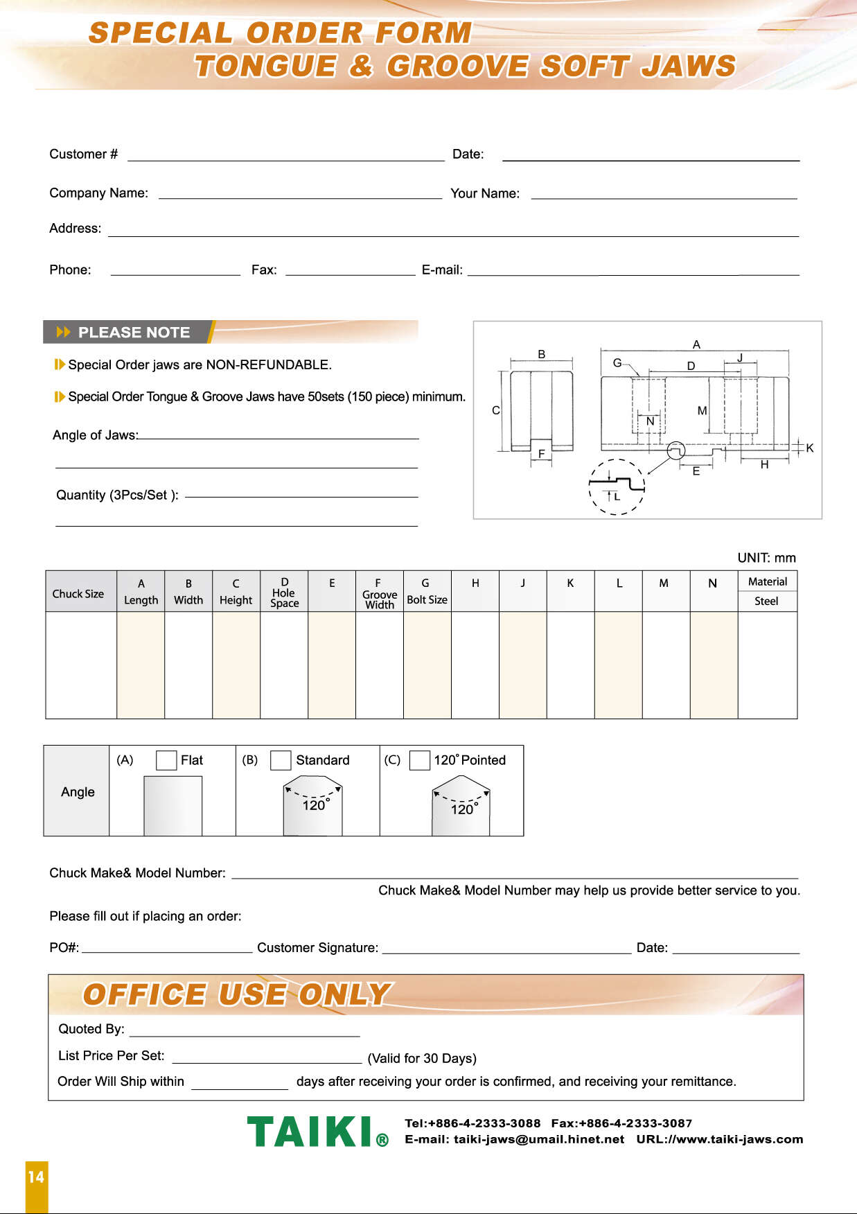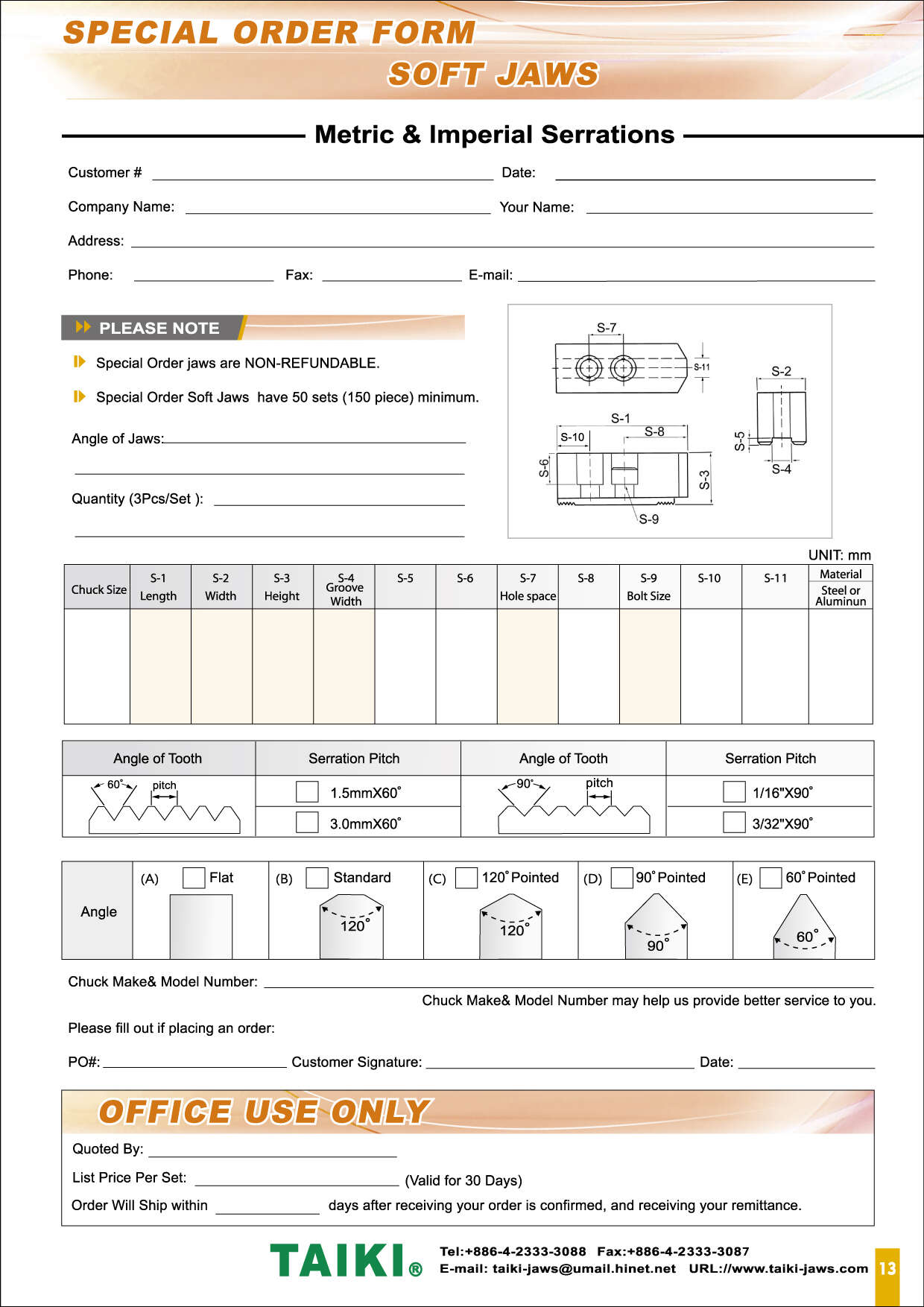 Soft Top Jaws as power chucks play a critical role of providing a safe and stable method for gripping workholdings. TAIKI's Standard Type of Top Jaws is the most popular choice for turning which provides standard types from 60 to 120 degree pointed. Additionally, TAIKI Chuck Jaws can be suited for most popular brand Power Chucks including Kitagawa and many popular brands, It also provides Extra-Height Type in a range of 70mm to 200mm height; Extra-Width Type applies to thinner, deformable and bigger covering range over 60mm; Extra-Length Type is ideal for using in parts over 250mm. Yet, the company is available to provide materials in carbon steel,aluminum or polyacetal (POM) which can be used for different workpiece. These professional looking materials in aluminum and POM get results that workpiece will not easy broken or any scrape.
