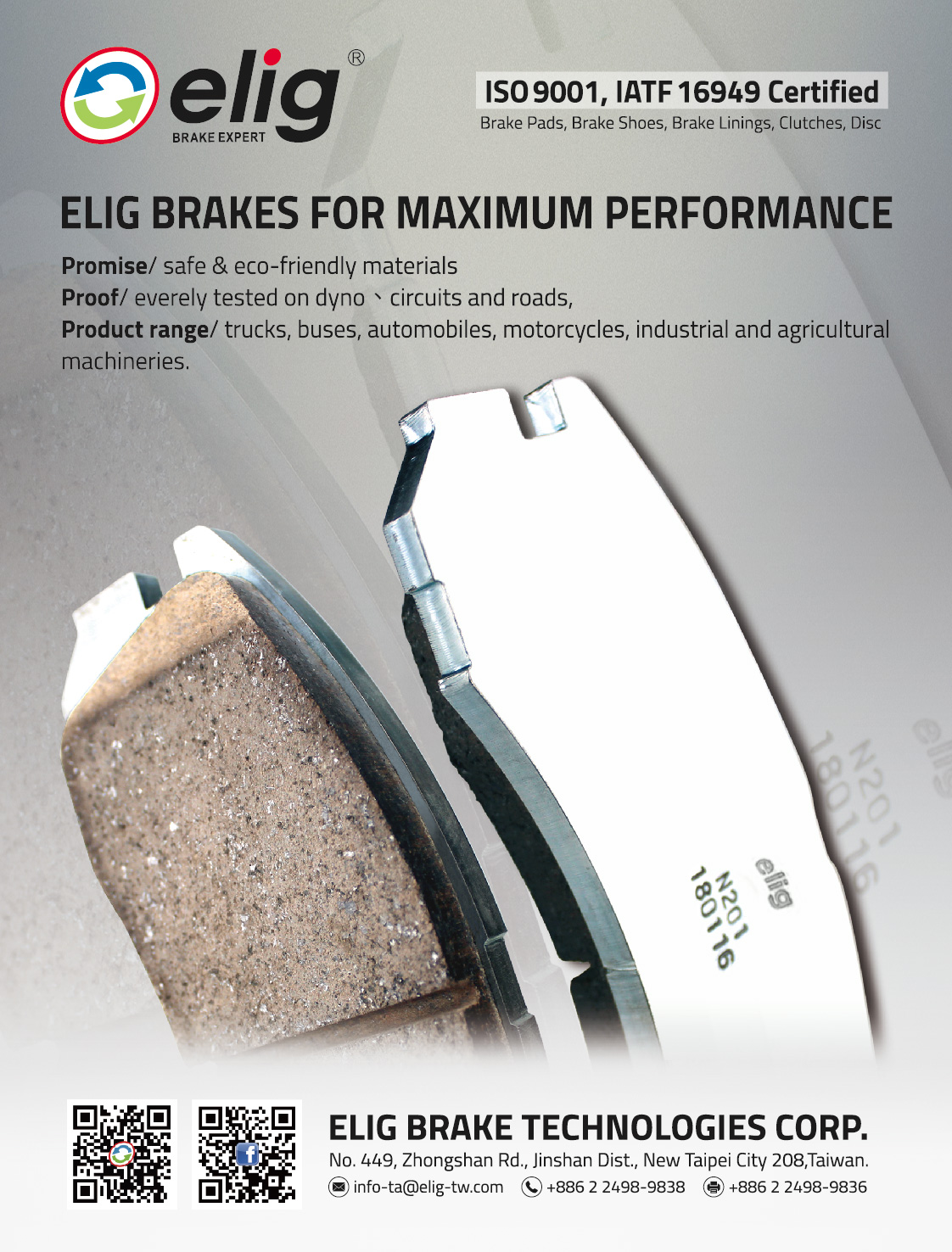 Elig Brake Technologies Corp. (formerly Elig Industrial Co. LTD.) was established in 1998. The founders devoted to the development of eco-friendly products of non-asbestos friction materials, and that has successfully applied to bicycle disc brake systems - a pioneer in the industry.