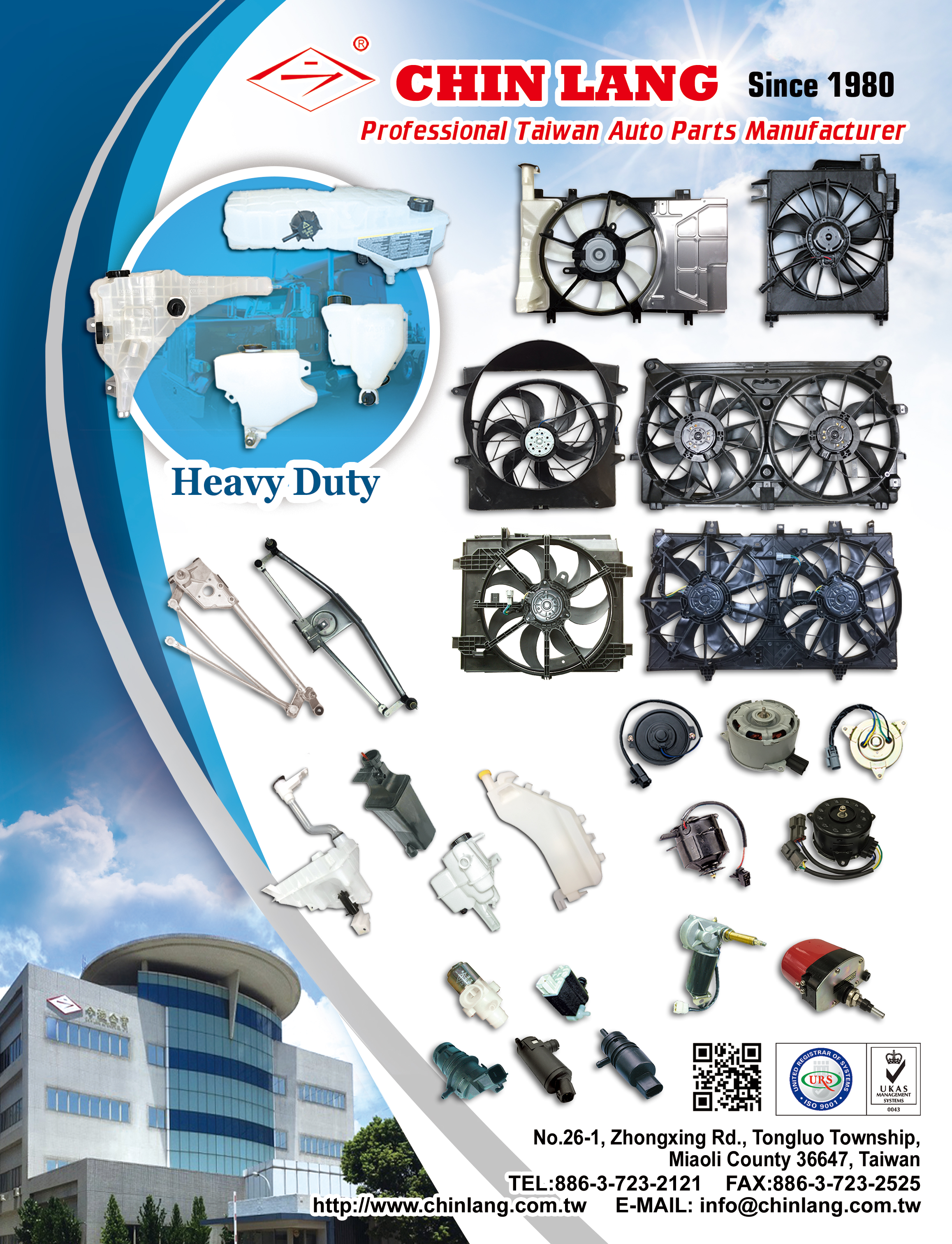 Chin Lang Autoparts Co., Ltd. is a leading manufacturer and exporter of auto parts in Taiwan which established in October 1980, specializing in Auto Cooling Fans, Motors and Plastic Tanks. Our products include cooling fans for radiators, cooling fans for air conditions, windshield washers, expansion tanks, washer pumps, washer nozzles, wiper motors, wiper links, fuel gauges.