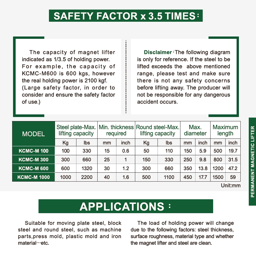 5.The load of holding power will change due to the following factors: steel thickness, surface roughness, material type and whether the magnet lifter and steel are clean.