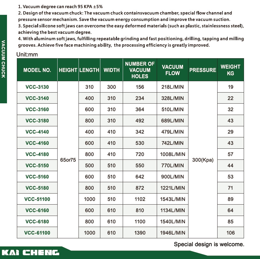 1.Clamping any non-magnetic materials. 2.No sealing strip required. 3.Can be used with coolant flushing. 4.Can be used with protection board. 5.Can be milled and drilled through.
