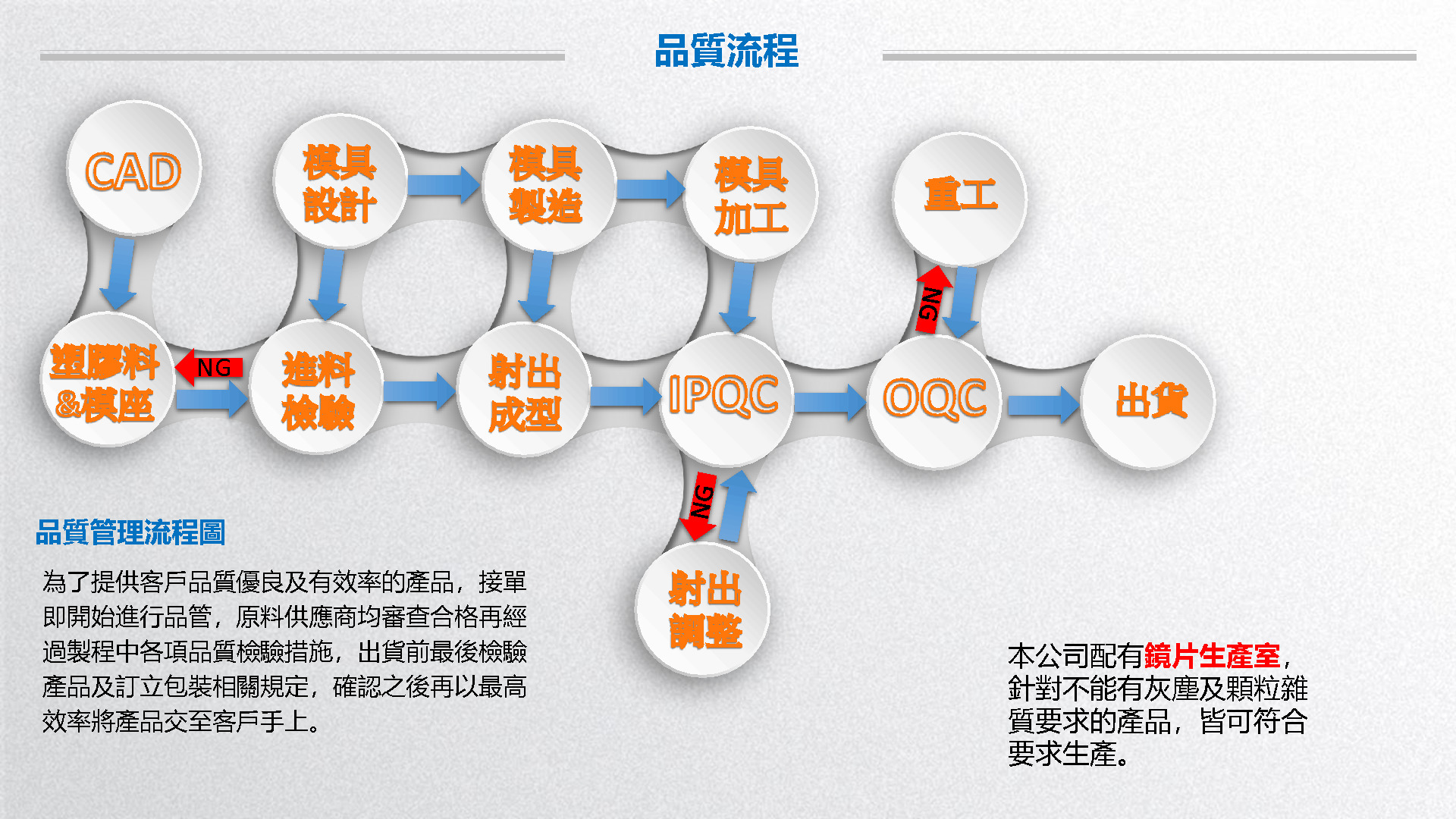 由於對塑膠品質的堅持,我們取得ISO9001:2015認證,藉由標準作業流程提升生產線效率及品質。旭寶團隊秉著對塑膠的熱誠與誠信服務客戶,不斷的提升塑膠射出專業技術,盡力滿足客戶需求。