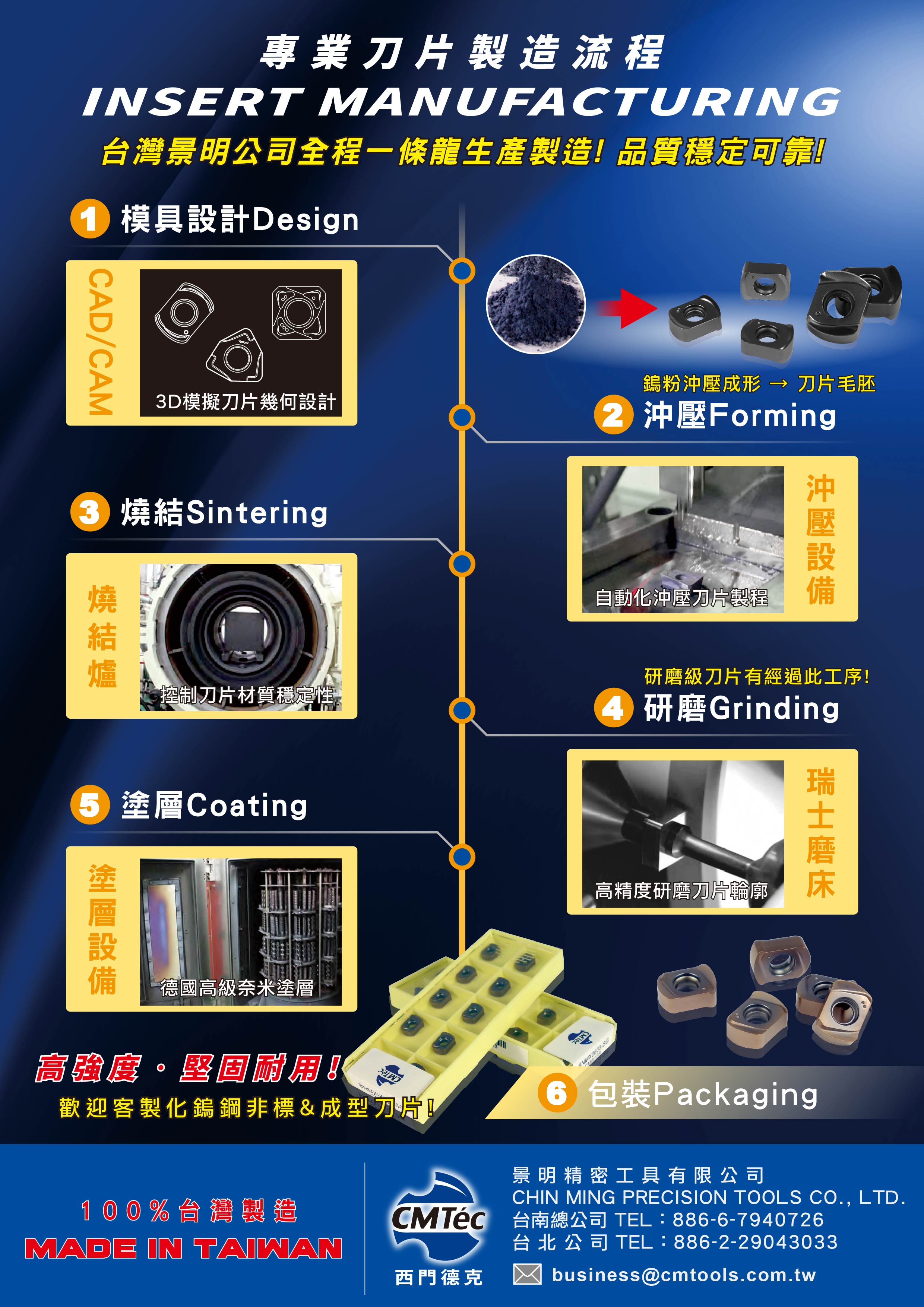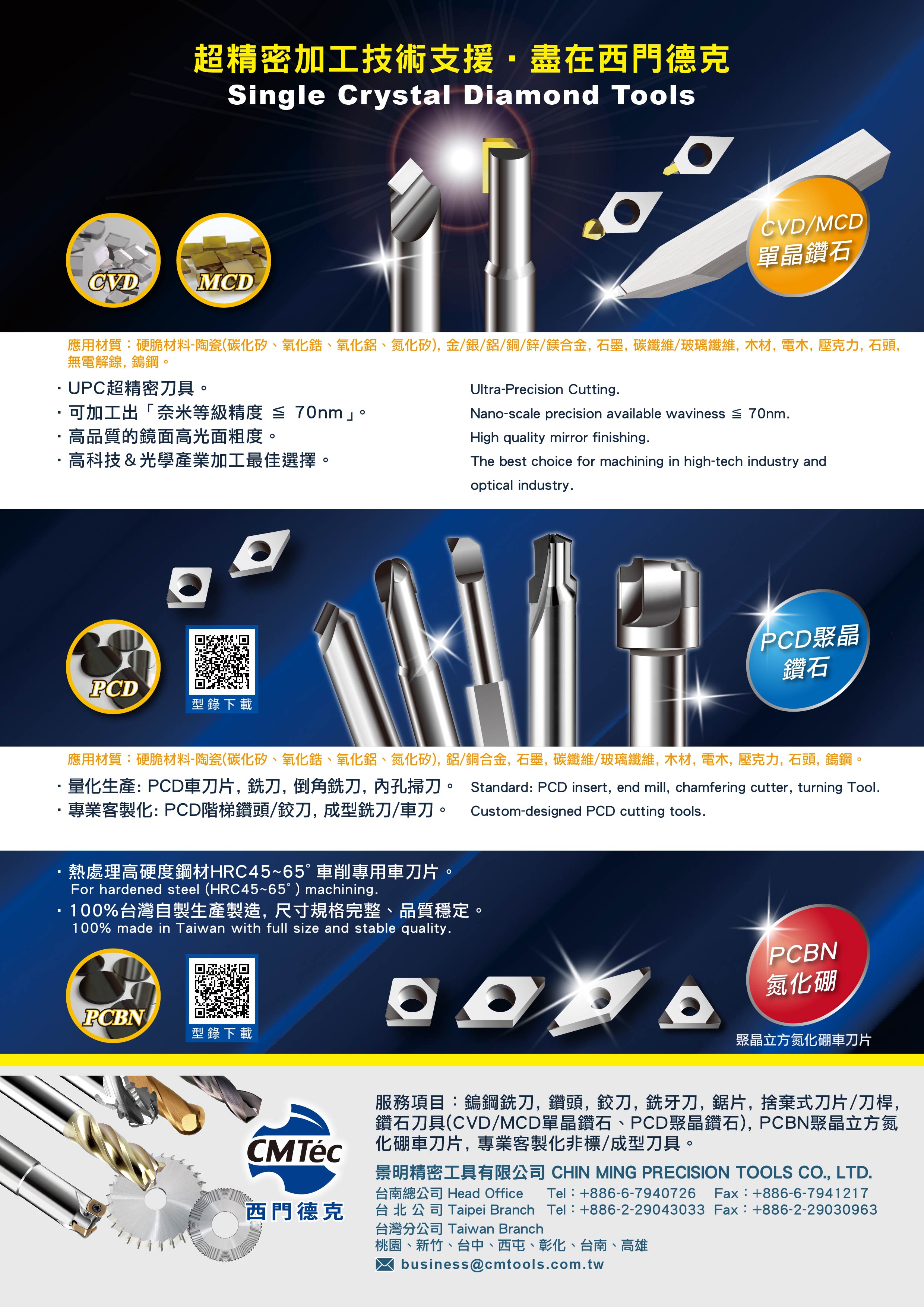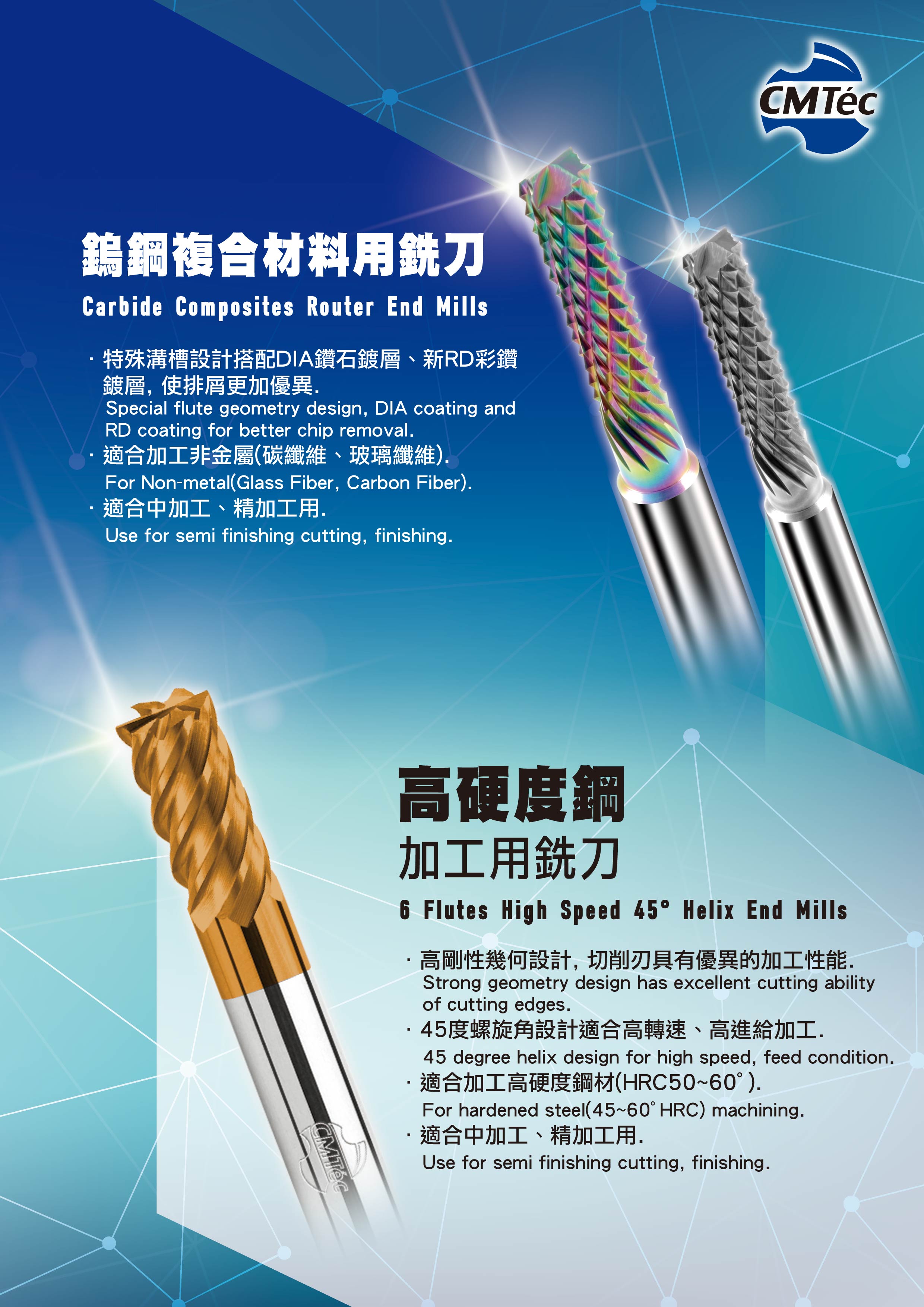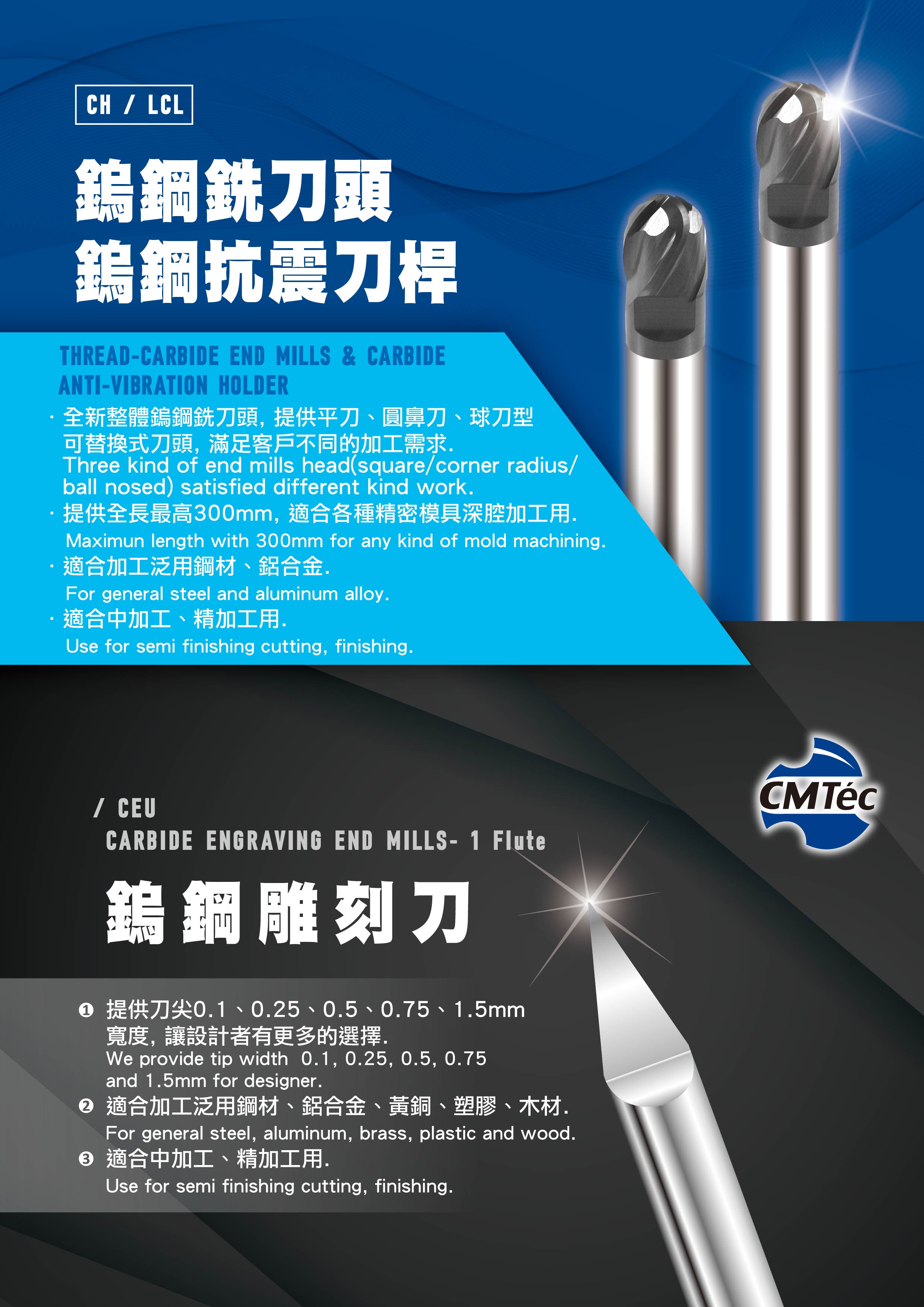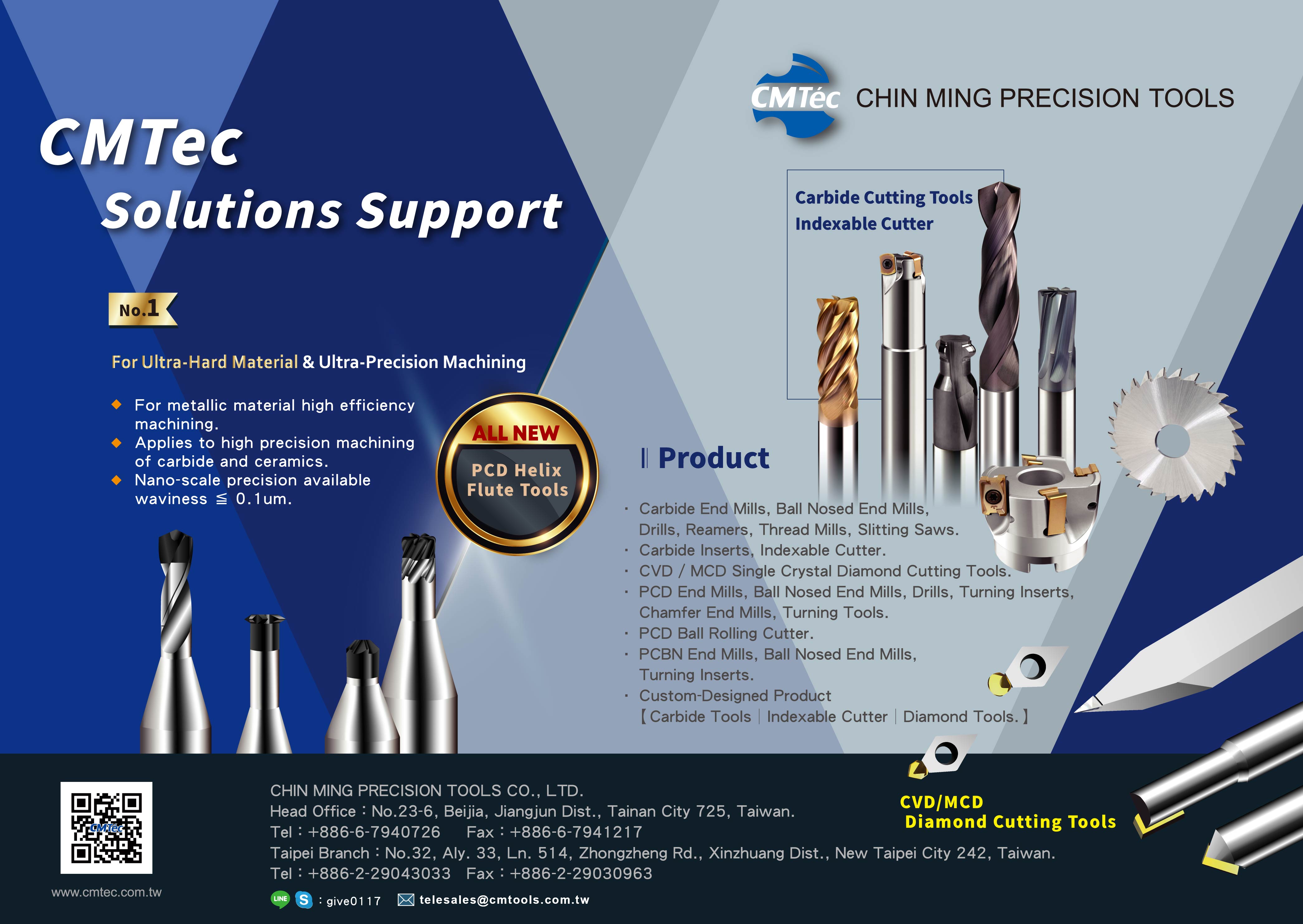 我們製造技術技藝精湛,專業生產鎢鋼銑刀、鑽頭、鉸刀、銑牙刀、鋸片、捨棄式刀片/刀桿、CVD/MCD/PCD鑽石刀具、PCBN刀具,並協助業界精密零件開發所需之特殊成型刀具,從刀具3D模擬、幾何參數設計、刀具研磨、測試、銷售、再生研磨,皆有最頂尖的專業團隊負責,提供客戶完整的解決方案。