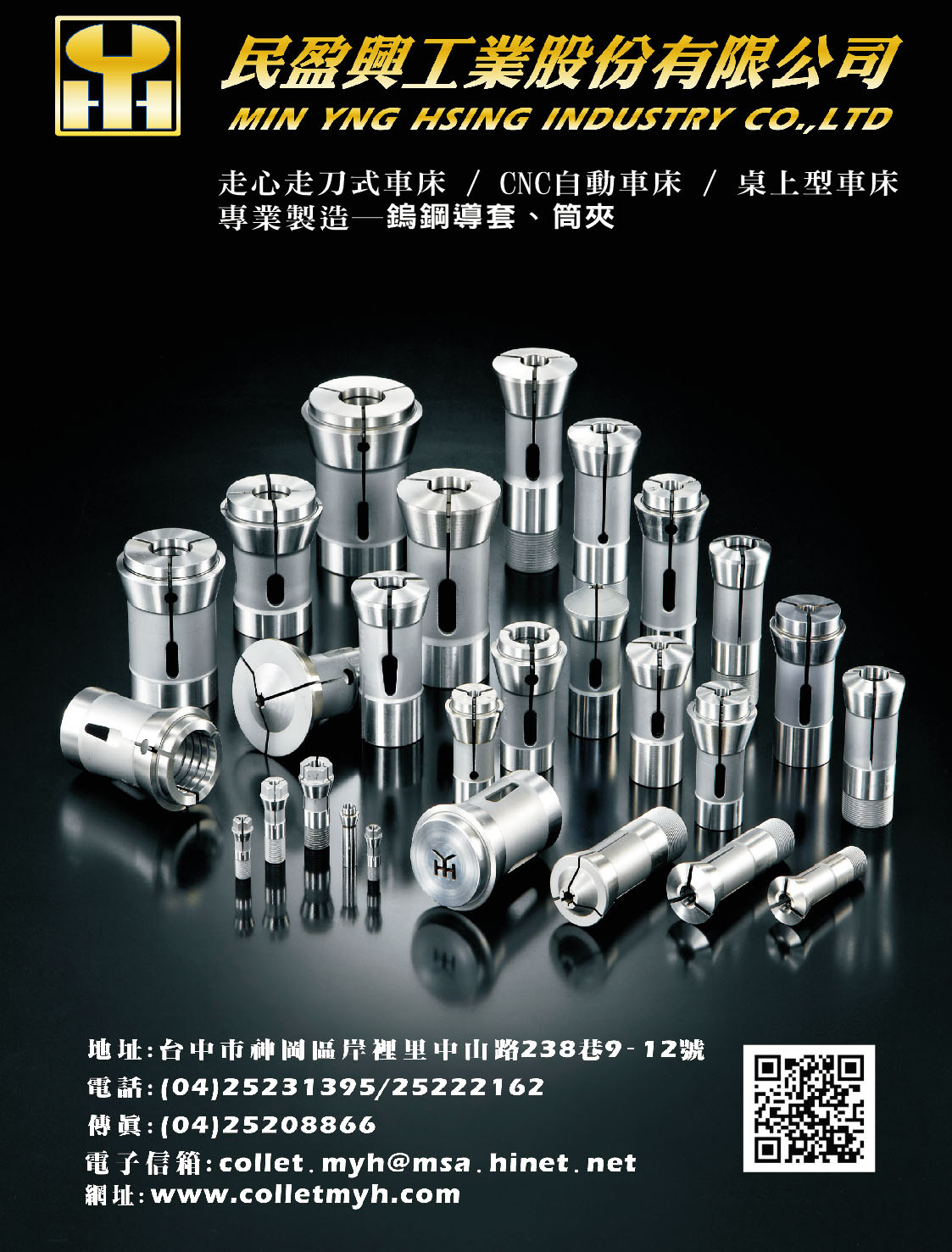 民盈興工業股份有限公司, 創立於1 9 7 8年專業製造彈性筒夾、鎢鋼導套筒夾, 服務業界多年, 深受各界肯定支持、精益求精永續經營是我們最終目標。 未來會更致力於產品品質、專業技術提昇來回饋客戶,也歡迎各界先進廠商, 經銷商, 不吝垂詢。