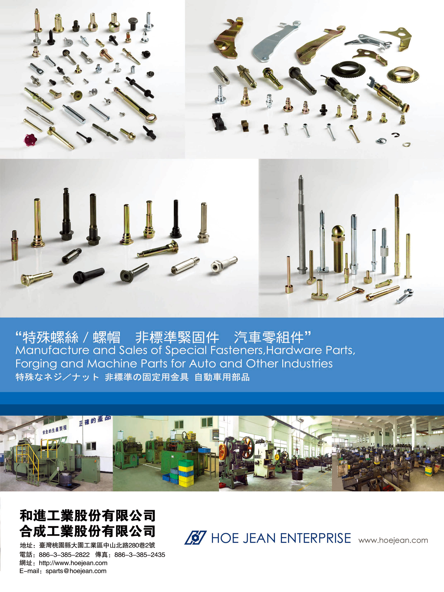 營業項目:主要生産和銷售汽車關鍵零部件、高強度特殊扣件、煞車制動器總成、汽車,摩托車專用鑄鍛毛胚件、家電用品五金零件、汽動工具零件、精密軸承、高張力螺絲等。