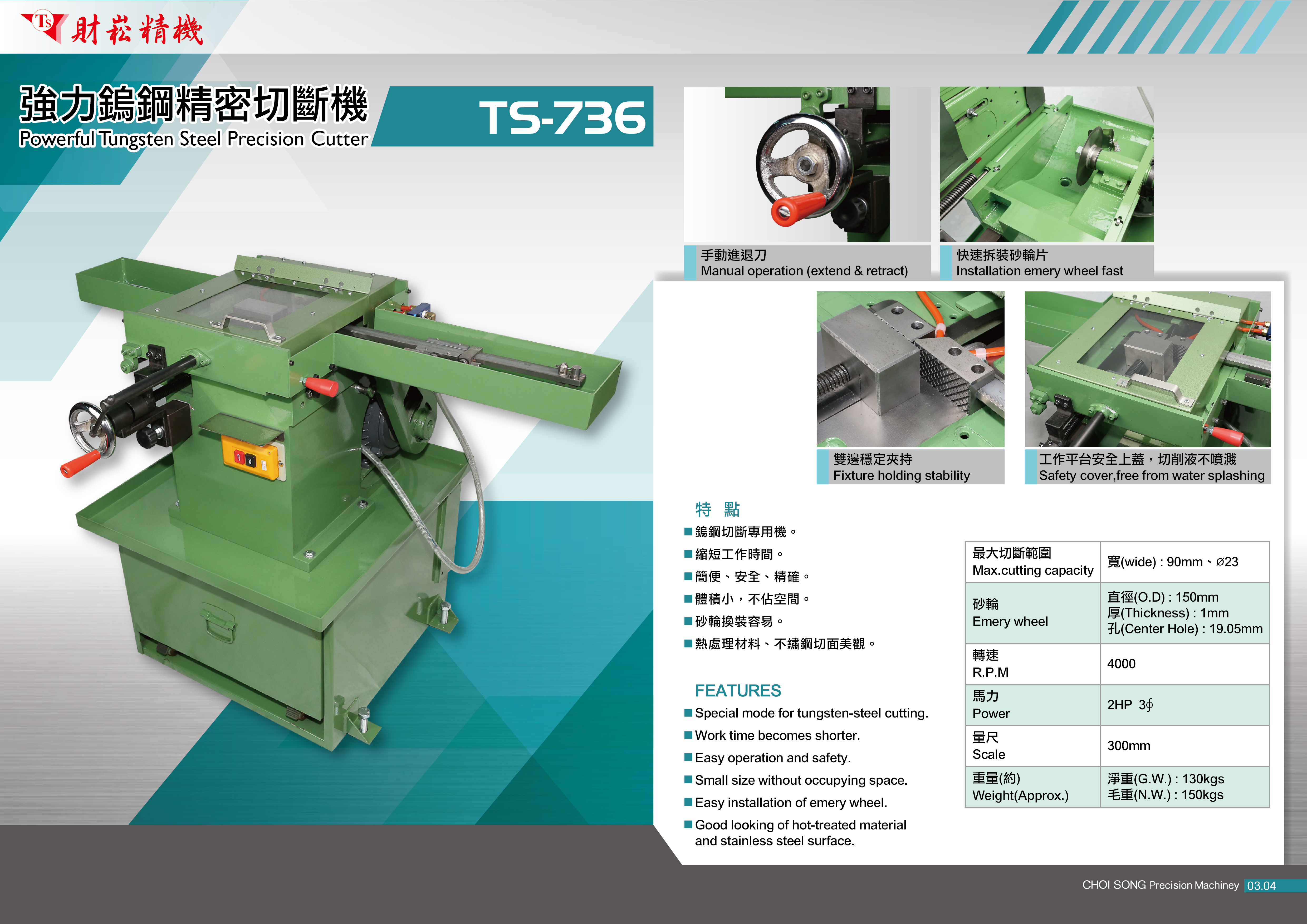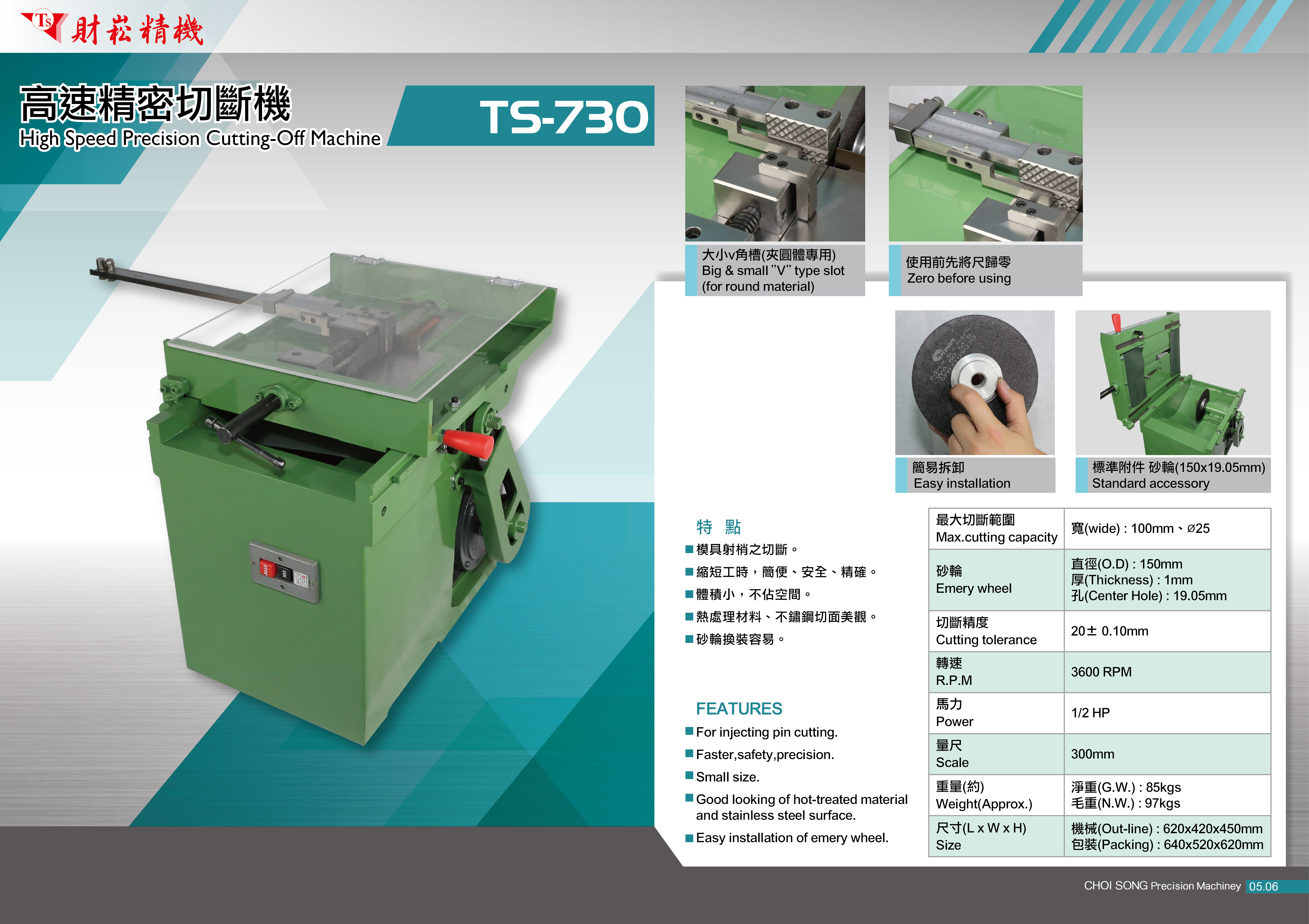 TS-730高速精密切斷機,具簡便、安全、不占空間,是各行各業工廠的必備機型,金屬、塑膠等常見材質皆能輕易切斷,不易損壞,維修簡單,常見客戶機台使用十餘年的財崧機器依然好用。
