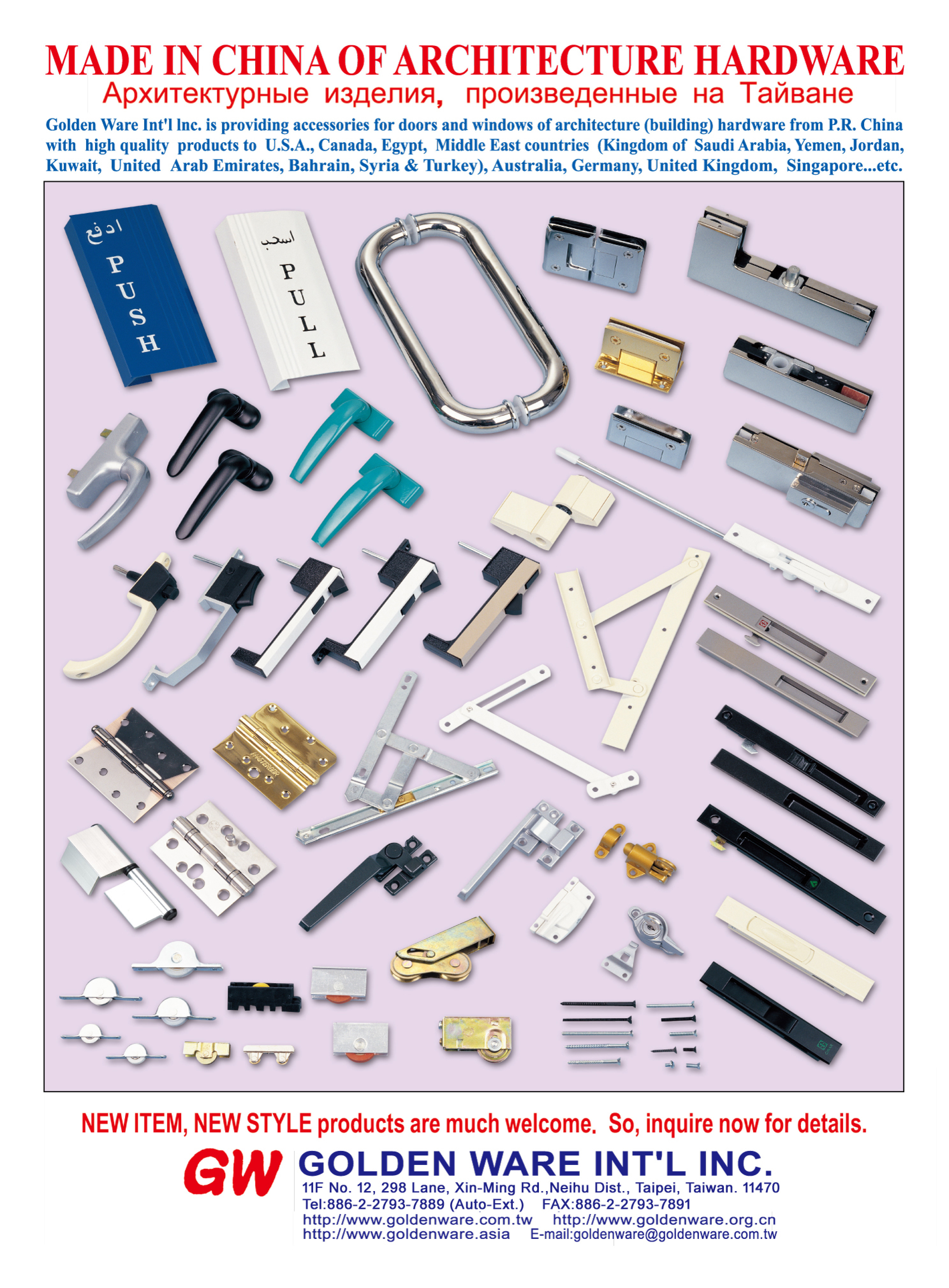 Golden Ware Int’l Inc. ( GW ) / GW Precision Metalwerks Inc. ( GWPM )GW / GWPM are Taiwanese company representing of Flood Sheild / Gate, Safety Ladder, Plumbing Fitting, Flange and Clamp ( Coupling), OEM Investment Casting, Gravity Die Casting & Die Casting, CNC Machining Parts, Hook & Building Hardware manufacturers from Taiwan and Mainland China since 1990. We have built long term relationships providing the service of international representation for source and product development at the lowest price & on time delivery. Our project management expertise has given large savings to many well known mass merchandise importers, home improvement and industrial building supply distributers and to original equipment manufacturers.
