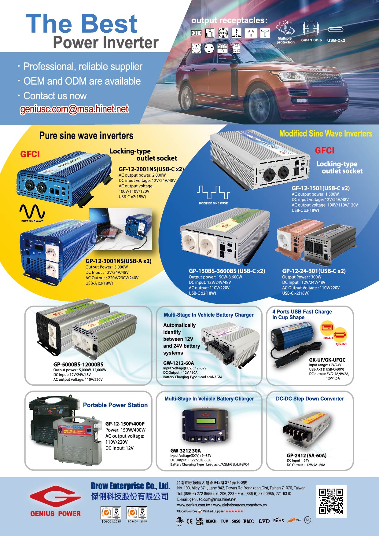 DROW was established since 1984. We specialized in manufacturing sine wave and modified sine wave DC to AC power inverters. Our "GENIUS" Brand is now successfully regarded as a major supplier in the field of solar inverters and UPS. Based on outstanding experience, we manufactured preferable solar related power products in order to make great effort for the environment protection. With the best quality, reliable price and innovate technology, our customers are assured to receive excellent services at all times! Our goal is to do our best to maximize the world energy effect and will benefit our society and earth to provide perfect living environment and quality.