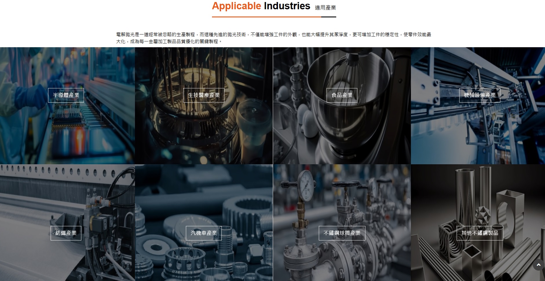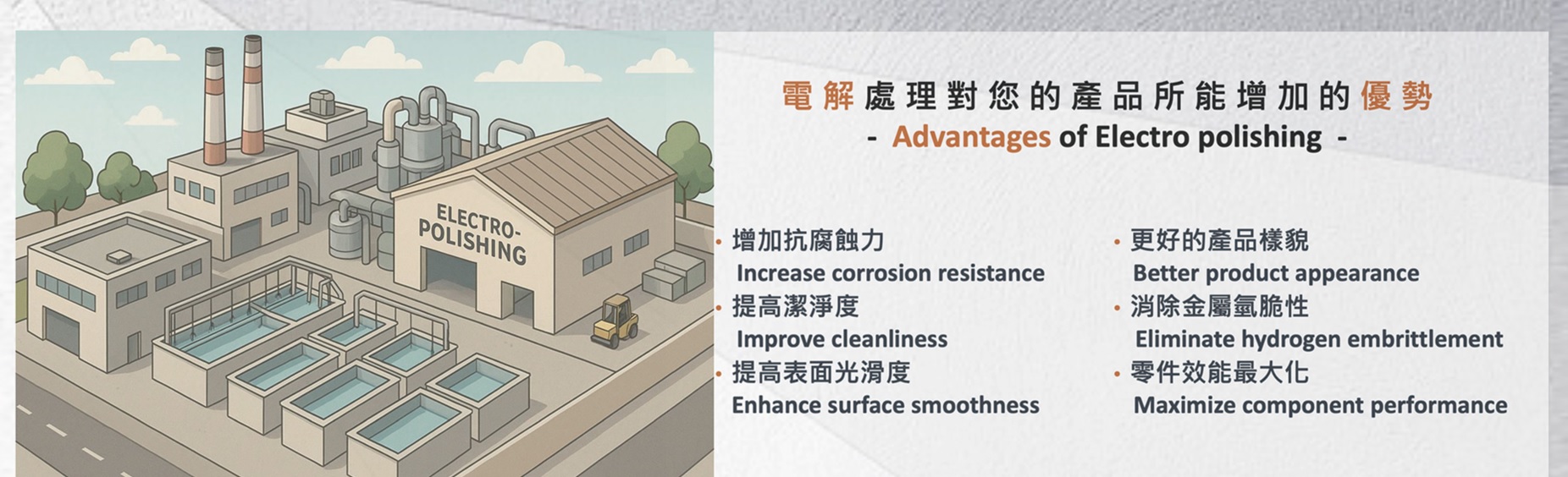 世揚貿易有限公司以產銷化學原料起家,提供自製配方產品電解液、PH調整劑、安定劑⋯⋯等藥劑販售,以及金屬加工處理的服務,提供不鏽鋼電解拋光(Electro Polishing,簡稱EP)以及不鏽鋼鈍化(Passivation Treatment)的加工服務,主力加工為機械機台設備(如:包裝機台、搬運機台、理瓶機台、切菜機台)、生技醫療器材(如:手術用醫療設備、嬰兒床架)、食品器具(如:蛋糕模具、打蛋盆、煎蛋器)、半導體真空管路(如:零配件、腔體)以及各式不鏽鋼產品(如:風管、風車葉片、桶槽、不鏽鋼閥類)⋯⋯等客製化生產。於2024年遷廠至太平產業園區,並於2025年增設無塵潔淨室,新增潔凈清洗及包裝的服務,提供低污染的空間給對產品潔淨度有要求的您能有多一個選擇。