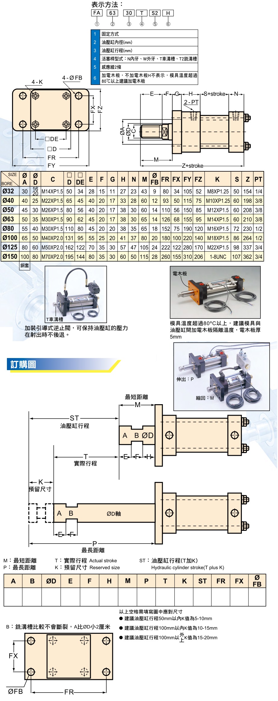 可加裝感應線在油壓缸上,不佔空間安裝容易 使用壓力:140 kg/cm2(14MPa) 感應式油壓缸附加磁性感應活塞搭配磁簧進接開關 可做訊號檢出。 1.固定方式 2.油壓缸內徑(mm) 3.油壓缸行程(mm) 4.活塞桿型式:N內牙、W外牙、T車溝槽、T2銑溝構 6.感應線2條 7.加電木板,不加電木板H不表示,模具溫度超過80度C以上建議加電木板