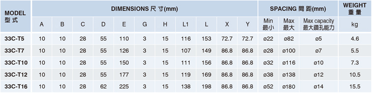 * 限用於調整等距三角形加工使用 * 可調式軸承範圍 : ø22 - ø180 mm。 * 鑽孔能力 : ø1 - ø 14 mm。 * 主軸可正逆轉,適合鑽孔及攻牙 * 鑽孔頭可承受高速運轉達 6000 RPM。