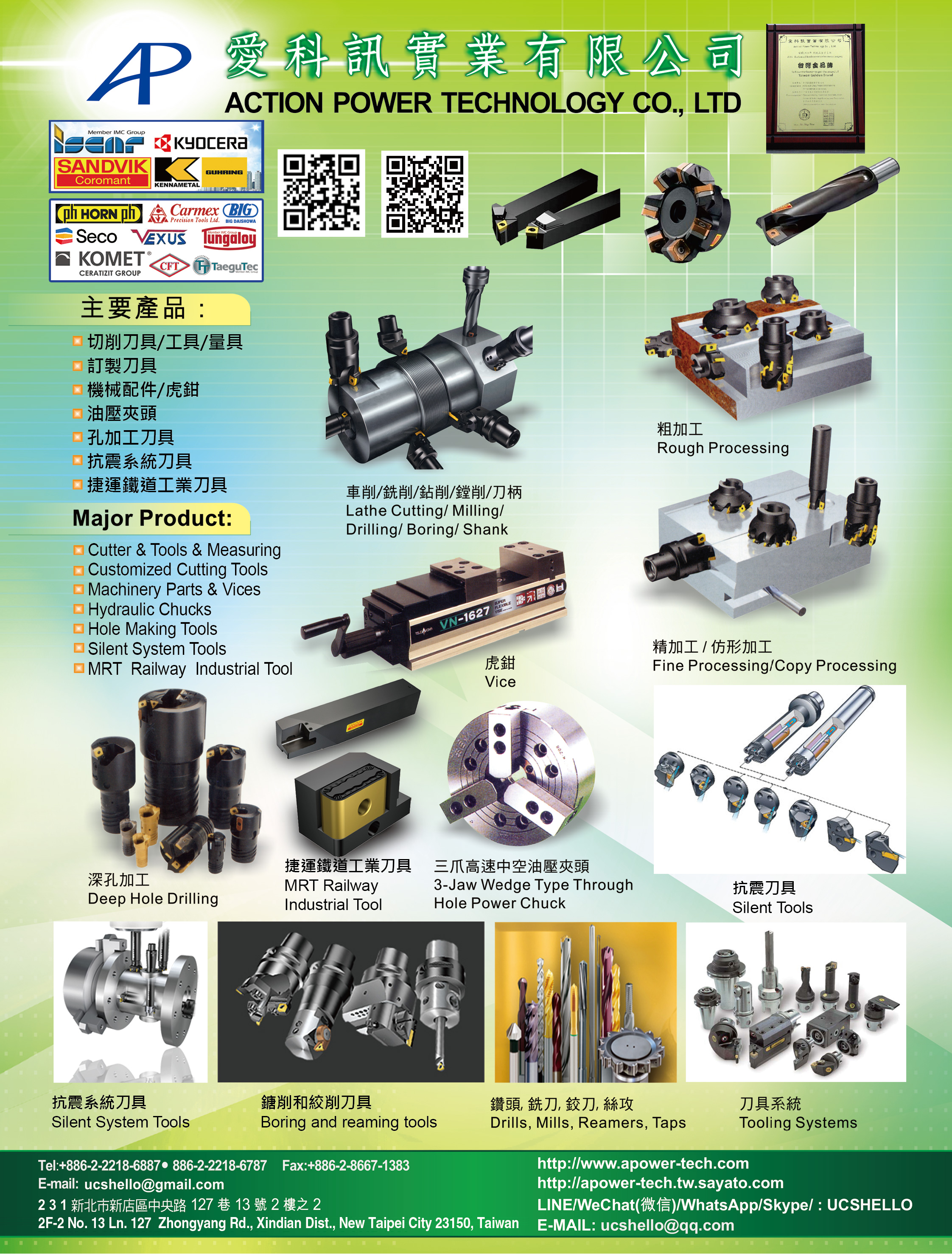 外銷美國,歐洲,及日本 :內徑刀柄,外徑刀柄,牙刀刀柄,平面銑刀,側銑刀,端銑刀,殼式端銑刀,卡式刀座,車刀,